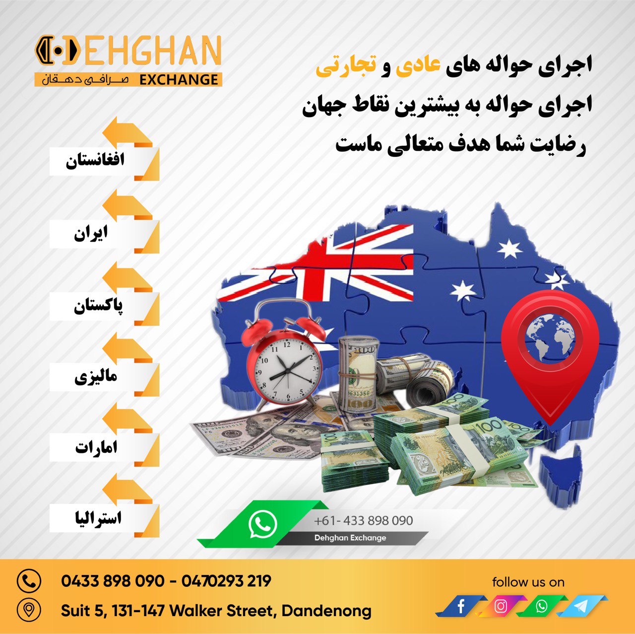 Dehghan Exchange makes sending money and exchanging currency simple, fast, and secure. You can transfer funds from Australia to the USA, Canada, Malaysia, UAE, Afghanistan, Iran, Pakistan, and France. We offer great exchange rates and low fees, ensuring your money reaches its destination safely and on time. Whether you need to send money to family, make business payments, or handle personal transactions, we make the process easy and hassle-free.